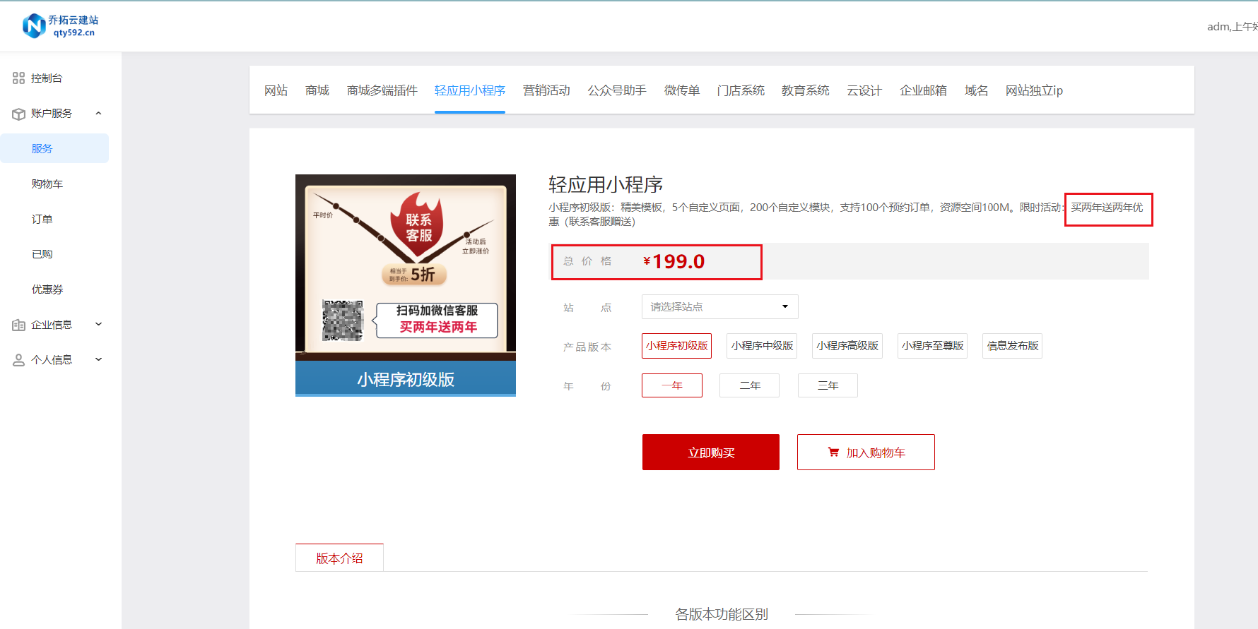 选好模板后,通过简单的拖拽操作,最快 5 分钟就能搭建好小程序的初稿。而且,价格非常亲民。轻应用初级版一年只要 199 元,现在还有买两年送两年的活动,算下来四年才 398 元。