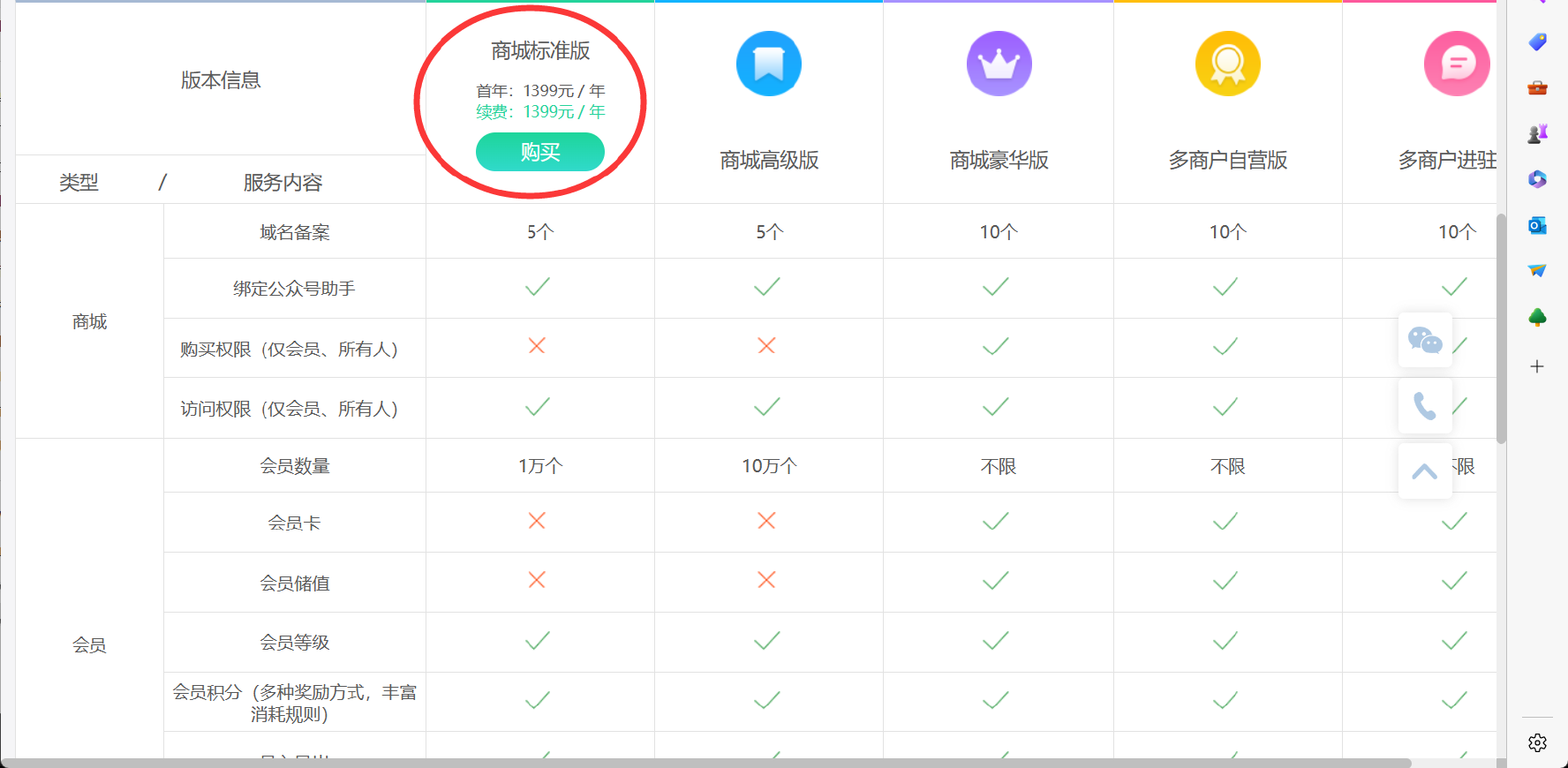 商城标准版一年 1399 元,