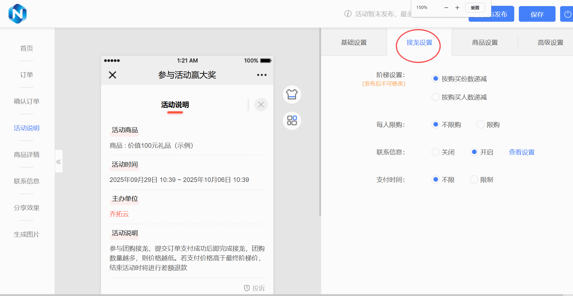 在乔拓云【拼团设置】里,直接勾选 “阶梯拼团”,填好价格、人数、报名信息项,1 分钟就能设置完,不用写复杂条款。