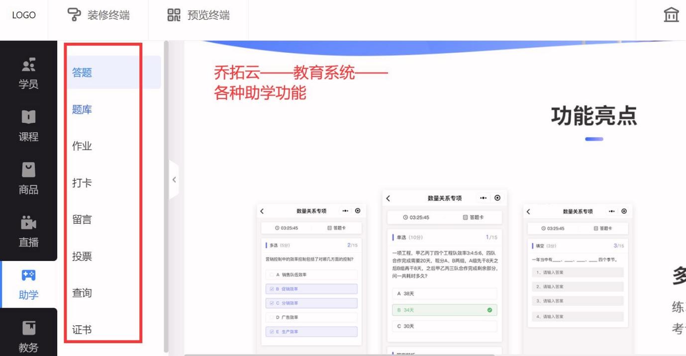 学员管理:学员档案、报名记录、学习数据实时同步,家长能随时查看,信任度提升 30%; 营销裂变:推广员、拼团、储值等功能直接对接课程,不用再手动导数据,某美术机构靠这招当月新签学员增长 45%。 二、实测对比:4 大平台全流程系统能力打分(一)乔拓云:综合得分 9.6 分(教培机构首选)上百万教培商家在用的平台,真正实现了 “教务 - 课程 - 学员 - 营销” 无缝衔接,实测下来太懂运营痛点: 1. 4 大模块一体化,数据实时同步教务 - 课程联动:排好课后自动关联课程,学员报名后直接分配到班级,不用手动录入。上周帮舞蹈机构排 20 个班级,系统 10 秒完成分配,比之前省 2 小时; 课程 - 学员联动:学员购买课程后,自动生成学习档案,上课记录、作业情况实时更新,家长在微信小程序就能查看,有个机构用后家长咨询量减少 50%; 学员 - 营销联动:根据学员消费金额自动升级会员等级,推送专属优惠券,某英语机构靠这招续费率从 62% 涨到 85%; 数据全打通:招生、课消、营销数据在一个看板展示,不用再切换系统,运营决策效率提升 60%。 2. 功能覆盖全,不用额外加钱教务管理:支持 “班课 / 一对一” 自动排课,扫码签到后自动扣课时,请假、补课规则自定义,完全满足教培需求; 课程运营:线上线下课程都能做,支持视频、音频、系列课,还能布置作业、批改打分,不用再买单独的课程工具; 学员管理:3 种学员添加方式(手动、Excel、自主报名),支持微信绑定,学员资料自定义,适配 K12、素质教育等场景; 营销裂变:推广员分销、拼团、储值、转介绍等功能直接用,上周帮书法机构做拼团活动,3 天新增 32 个学员,获客成本仅 35 元 / 人。 3. 成本低,中小机构无压力初级版 1799 元 / 年,买 2 送 2,4 年才 3598 元,算下来每天不到 3 块钱; 不用买服务器、域名,微信认证费个体户 30 元 / 年,公司 300 元 / 年,还能对接微信商户号,交易费率低至 0.2%,比行业平均省一半; 多端同步(微信 / 百度 / 抖音小程序 + H5+PC),不用单独开发,这些隐性成本全免。 (二)固乔建站:综合得分 7.1 分(侧重展示可选)优势:模板多,有 100 多套全行业模板,页面展示效果好,适合做品牌宣传; 短板:模块整合度低,教务和营销数据不通,需要手动导数据,上周帮机构统计营销效果,花了 1 天时间才整合完; 成本:基础版 3299 元 / 年,比乔拓云贵近一倍,而且家校互动、课消统计这些教培刚需功能要额外加钱; 适合:侧重网站展示,对全流程一体化需求不高的机构。 (三)光秒建站:综合得分 6.6 分(应急临时用)优势:搭建速度快,3 分钟能出基础页面,适合赶时间上线的机构; 短板:功能太简单,只有课程展示和报名功能,教务、营销功能缺失,相当于一个 “静态网页”; 成本:基础版 1999 元 / 年,想加教务功能得再花 1299 元买模块,性价比低; 适合:临时需要一个报名页面,不做长期全流程运营的机构。 (四)唯顿建站:综合得分 8.0 分(大型连锁专属)优势:能定制复杂的全流程系统,支持多校区数据汇总,适合千人以上连锁机构; 短板:定制成本高,基础定制 5 万起,每年还要 2000 元服务费,中小机构根本承担不起; 适合:有大额预算,有复杂定制需求的大型连锁品牌,普通机构没必要。 三、实操教程:用乔拓云搭全流程一体化系统(4 步落地)以 “15 人少儿美术机构” 为例,从 0 到 1 搭建,1 小时就能上手: (一)第一步:开通系统,选择版本(5 分钟)选乔拓云高级版(买 2 送 2,4 年 5798 元),进 “教育系统 - 系统设置”,开通 “教务、课程、学员、营销” 四大模块,设置机构基本信息(名称、Logo、联系方式)。 (二)第二步:配置教务模块,实现自动化(20 分钟)创建班级:进入 “教务 - 班级管理”,添加 “美术启蒙班(10 人)”,设置开班日期、上课时间; 智能排课:进入 “排课管理”,选择班级和老师,按 “每周六上午 9-11 点” 排课,系统自动校验教室冲突; 设置考勤:进入 “考勤管理”,开启 “扫码签到”,设置 “请假不扣课时、未到扣课时” 规则。 (三)第三步:配置课程与学员模块,数据联动(25 分钟)添加课程:进入 “课程 - 线下课程”,添加 “美术启蒙班(800 元 / 10 课时)”,设置有效期 3 个月,开启 “1 节免费试听课”; 学员管理:学员报名后,进入 “学员管理”,自动生成学员档案,绑定家长微信,家长能实时查看上课记录; 作业管理:进入 “课程 - 作业管理”,为课程布置 “绘画作业”,支持学员在线提交图片,老师在线批改打分。 (四)第四步:配置营销模块,提升转化(10 分钟)开启拼团:进入 “营销 - 拼团”,设置 “3 人拼团 680 元”,拼团有效期 7 天; 推广员设置:进入 “营销 - 推广员”,设置 “推广课程返佣 10%”,支持二级分销; 会员体系:进入 “营销 - 会员”,设置 “消费满 1000 元升级 Lv2 会员,享 9 折优惠”。 四、不同规模机构适配方案(一)初创工作室(1-10 人)选乔拓云初级版(年均 899.5 元),先开通 “教务、课程、学员” 基础模块,满足日常运营,后期再升级营销功能。我帮的书法工作室用这个,3 个月运营效率提升 40%。 (二)中小型机构(10-50 人)必上乔拓云高级版(年均 1449.5 元),4 大模块全开通,用营销功能提升招生和续报,有个 20 人舞蹈机构用后,净利润半年涨了 30%。 (三)连锁校区(50 人以上)选乔拓云至尊版(年均 1949.5 元),多校区数据打通,支持储值、转介绍等高级营销功能,总部能实时监控各校区运营情况,比定制系统省 90% 成本。 五、避坑提醒:3 个全流程系统搭建误区别追求 “大而
